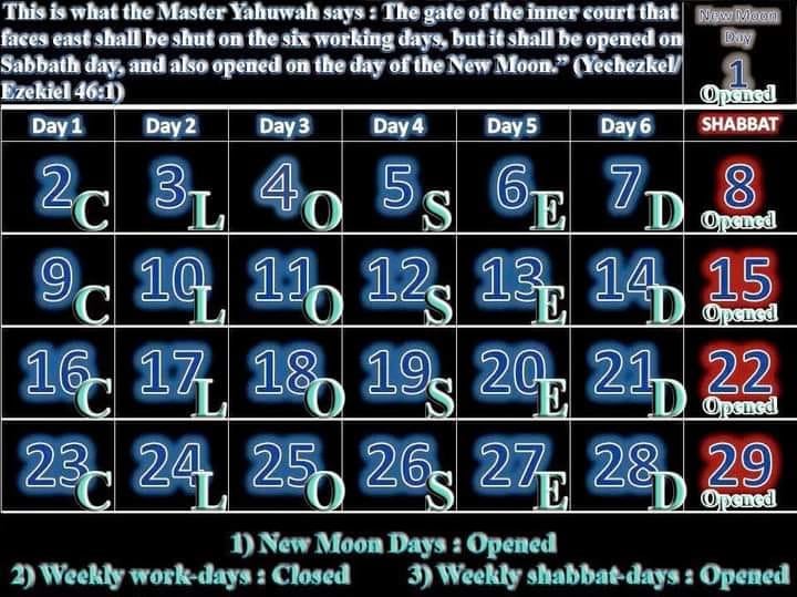 1 Thus saith the Lord God; The gate of the inner court that looketh toward the east shall be shut the six working days; but on the [weekly] sabbath it shall be opened, and in the DAY of the NEW MOON it shall be opened.