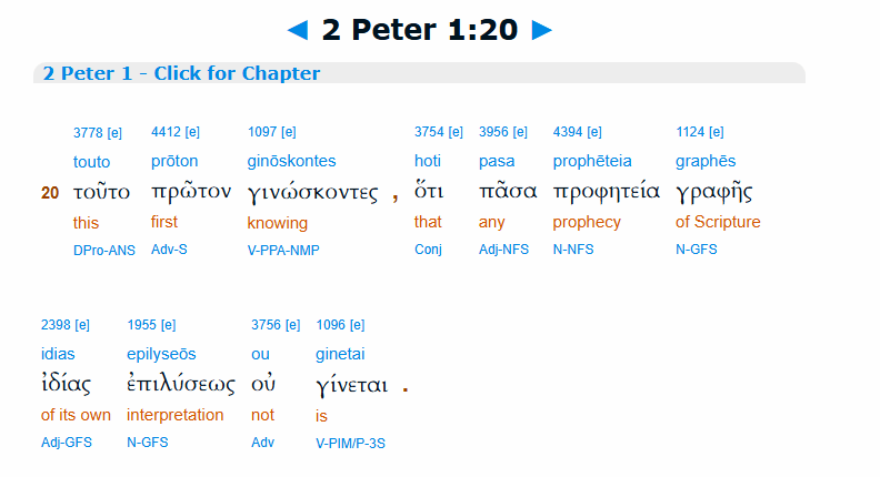 If there were another instance of G1955 being used anywhere in the Bible, then we could have a better understanding of which definition is more appropriate, depending on context, of course. Lacking this, we must allow the validity of either. Therefore, “private solution” is valid. The fact that the words in the New Translation are “private will of man” indicate that Joseph Smith was translating by revelation rather than by any scholastic method that we know. He moves beyond the literal translation to the intent. This intent is that we understand where these prophecies come from. This eliminates the need on our part of the reader to make the logical connection that I have drawn for you above. This shows that we can have confidence in the source of the Torah and prophets in the Bible and the Book of Mormon.